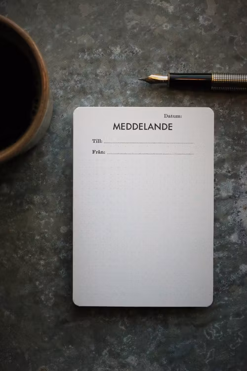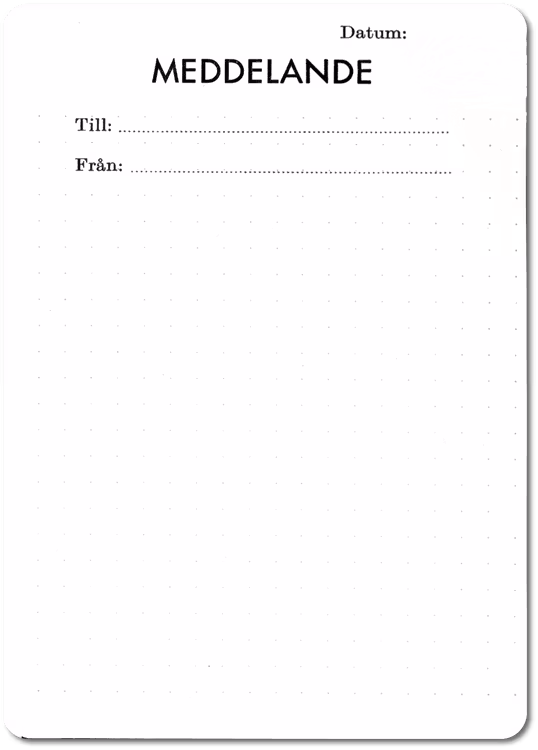 Lämna meddelanden med stil! Mindre formellt än ett brev men mycket mer stilfullt än en post-it-lapp. Kortet har titeln "Meddelande" och förtryckta fält för datum, till och från. Bakgrunden har ett rutnät av prickar i svagt tryck. Storlek B7 (88x125 mm). Tryckt på pappret Munken Lynx 220 g (certifierat EU Ecolabel, FSC™ och PEFC).