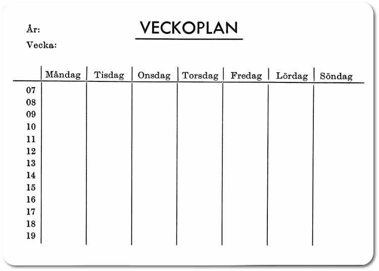 Veckoplanen har dagarna måndag till söndag och med klockslag från 07 till 19, samt fält för år och veckonummer. Genom att fylla i veckoplanen med det du ska göra i veckan och indikera hur lång tid det tar med t.ex. staplar mellan klockslagen får du en överskådlig bild av hur du kommer att spendera din tid i veckan.